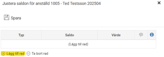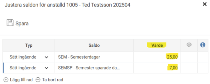 2. Sedan sätter ni värdet för ditt ingående saldo. Se exempel nedan. Här får Ted Testsson 25 st semesterdagar, och han har 7 st sparade dagar sedan innan.