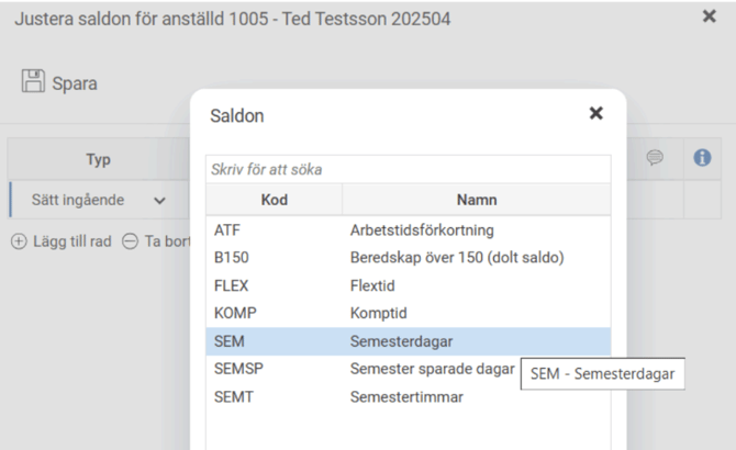 I kolumnen för "Typ" väljer ni "Sätt ingående" och sedan väljer ni vilket saldo ni önskar lägga in. in. I detta exempel väljer vi semesterdagar, men ni kan välja alla saldon som är tillämpbara i er organisation.
