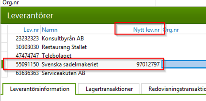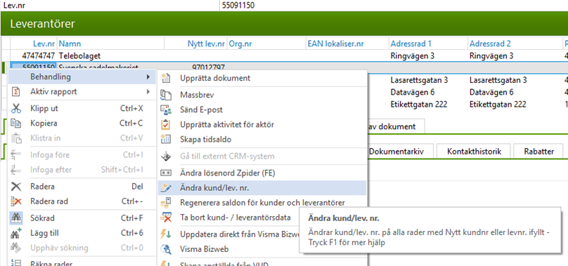 Markera leverantören och högerklicka och välj behandlingen ”Ändra kund/lev nr.”