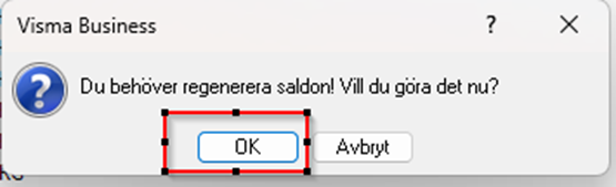 Ni kommer då att få upp denna fråga, svara OK på den. En regenerering kan ta en stund beroende av hur mycket data det finns i leverantörsregistret. Det ska inte göras om det samtidigt sker uppdatering av buntar som innehåller leverantörer. Ni kan svara nej på frågan och göra regenereringen vi ett senare tillfälle. Det måste dock göras annars kommer inte leverantörssaldon att stämma.