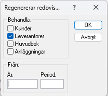 Kör ni regenereringen kommer ni att få denna dialog. Är ni säkra på att den leverantör som ni ”tar bort” inte har transaktioner innan innevarande år kan ni t.ex. skriva 2025 i år och 1 i period. Det gör att regenereringen kommer att gå fortare.